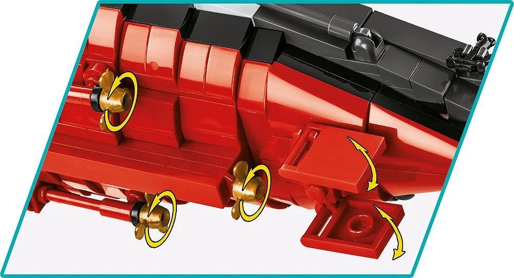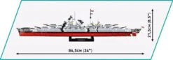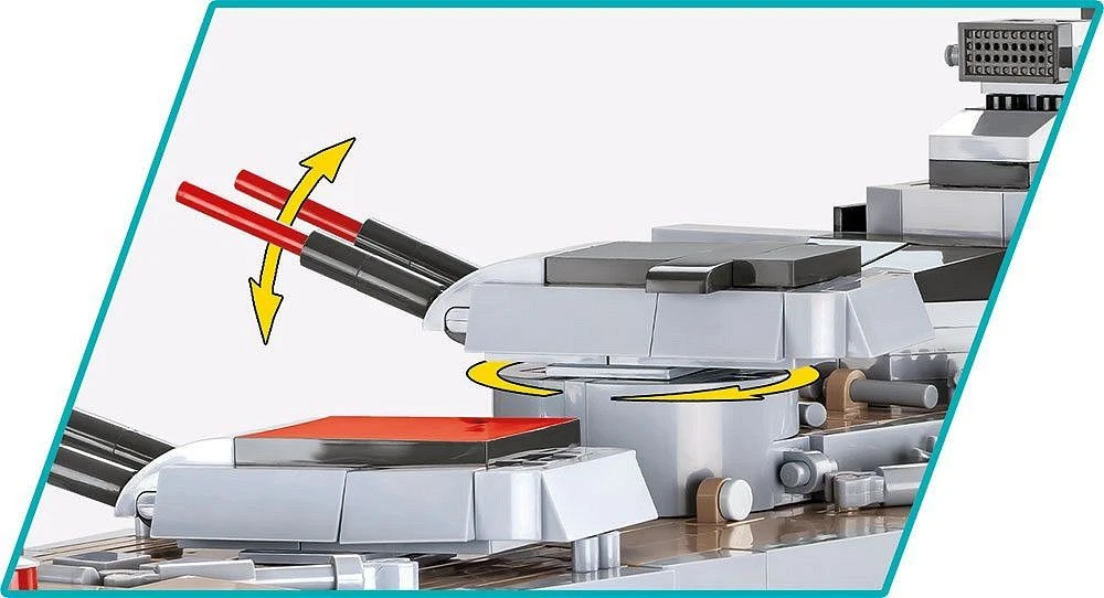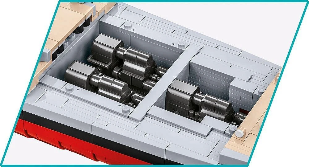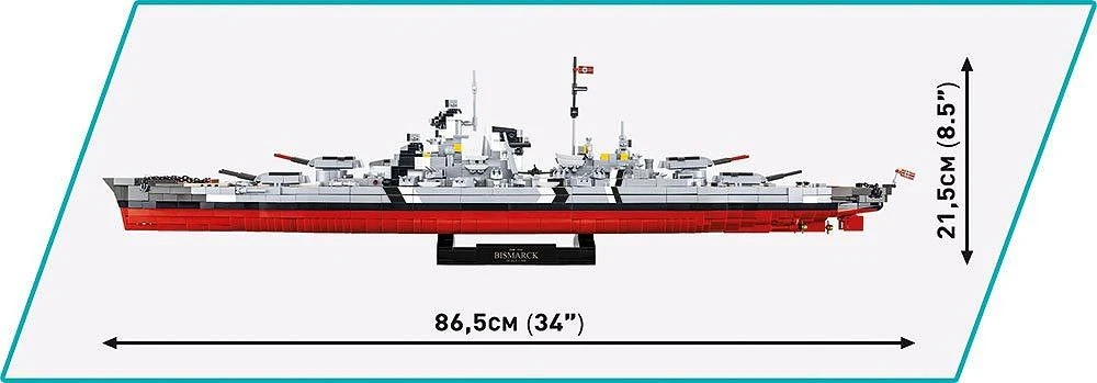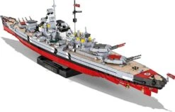 The all-new Bismarck model created by COBI was produced in a scale of 1:300. It consists of 2933 elements and is 86.5 cm long. The latest edition of Bismarck is a ship designed completely from scratch. It contains over 900 more bricks compared to older editions. It faithfully reflects the proportions of the historical ship and preserves all its essential elements, including the original camouflage. The design depicts the so-called “Baltic paint scheme”, i.e., camouflage containing black and white stripes and red tops of artillery towers. Such colours were used during training in the Baltic Sea. Numerous blocks feature high-quality, abrasion-resistant prints! The model has numerous movable parts such as propellers, rudders, rotating turrets and gun barrels that can be raised and lowered. The model is huge, has great display value and we especially recommend it to enthusiasts of naval history and building block collectors. It does not require gluing or painting because its entire body and all elements consist of COBI construction blocks.