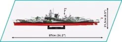 The ship model created by the COBI company was produced in a scale of 1: 300. Thanks to the use of the latest available elements and advanced construction techniques, the model faithfully reflects the proportions of the historic ship and retains all of its essential elements, including the original, very characteristic camouflage. It has numerous moving parts such as propellers, rudders, rotating towers and gun barrels that can be raised and lowered. The set also includes a very stable and aesthetic black display stand with a plate with the name of the ship printed on it. As it is a large and quite complex model, we recommend it mainly to veteran collectors and older, experienced brick fans. It does not require gluing or painting, because its entire hull and all elements consist of COBI construction blocks.