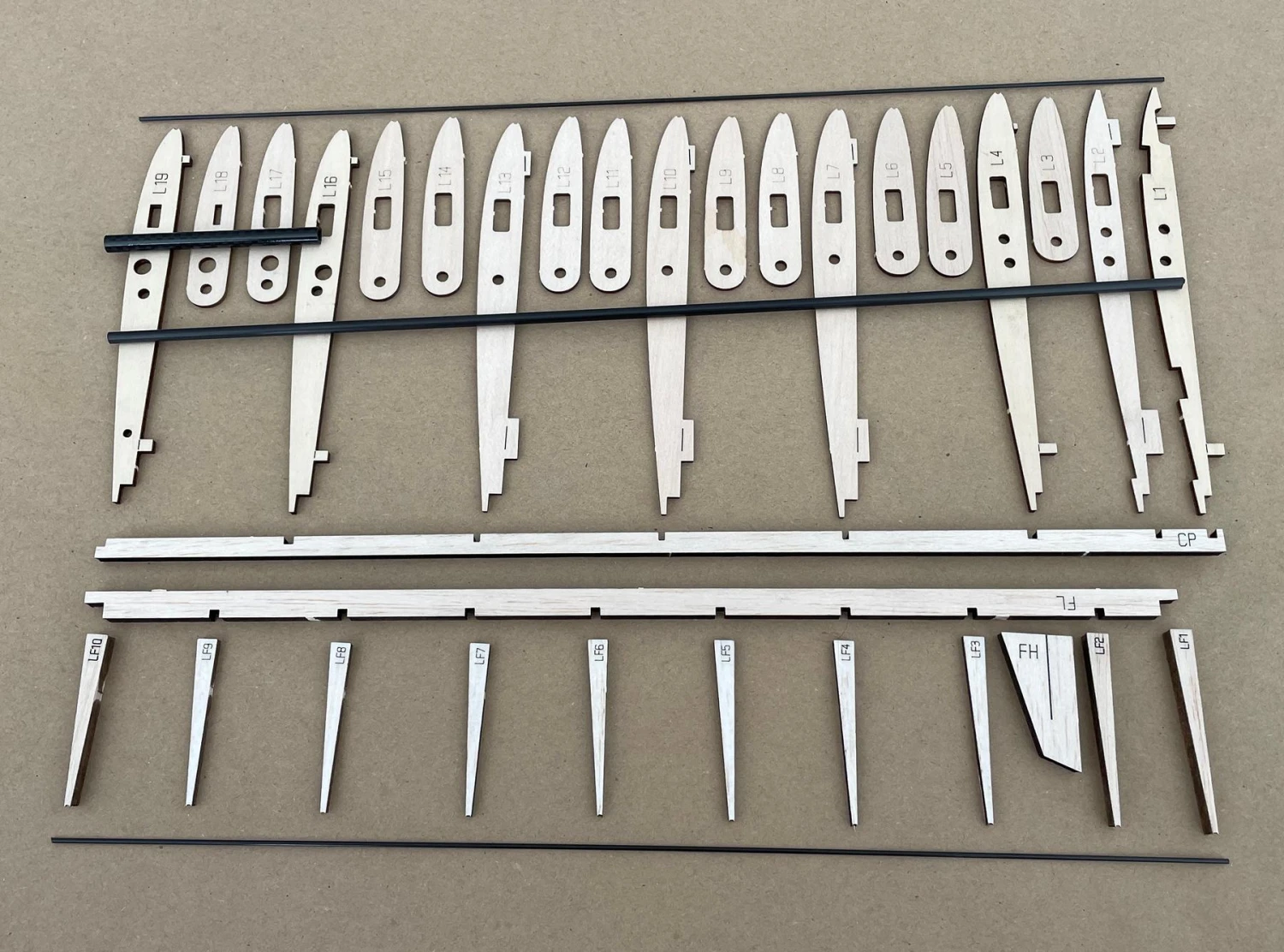 – Carbon tubes and rods required for assembly.