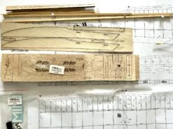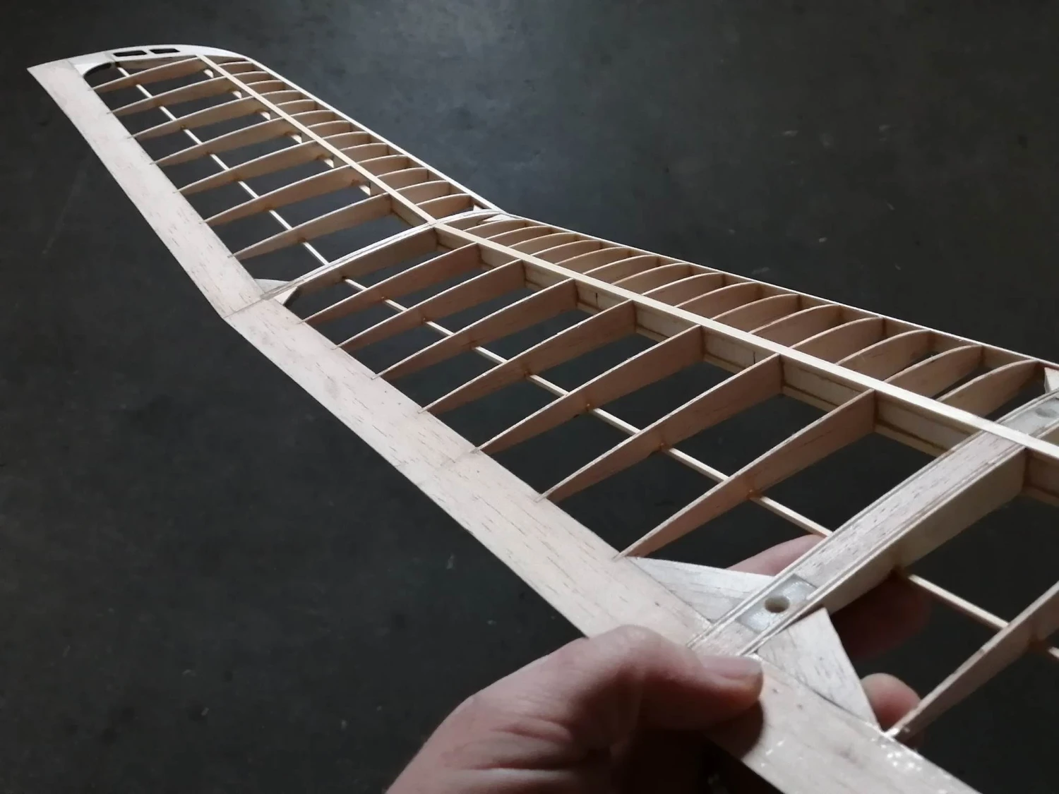 The wing is of conventional construction with spruce spars and riblets. The tails are quick build lightweight built up surfaces. The narrow fuselage is all wood construction with ply front sides and a balsa and spruce rear.