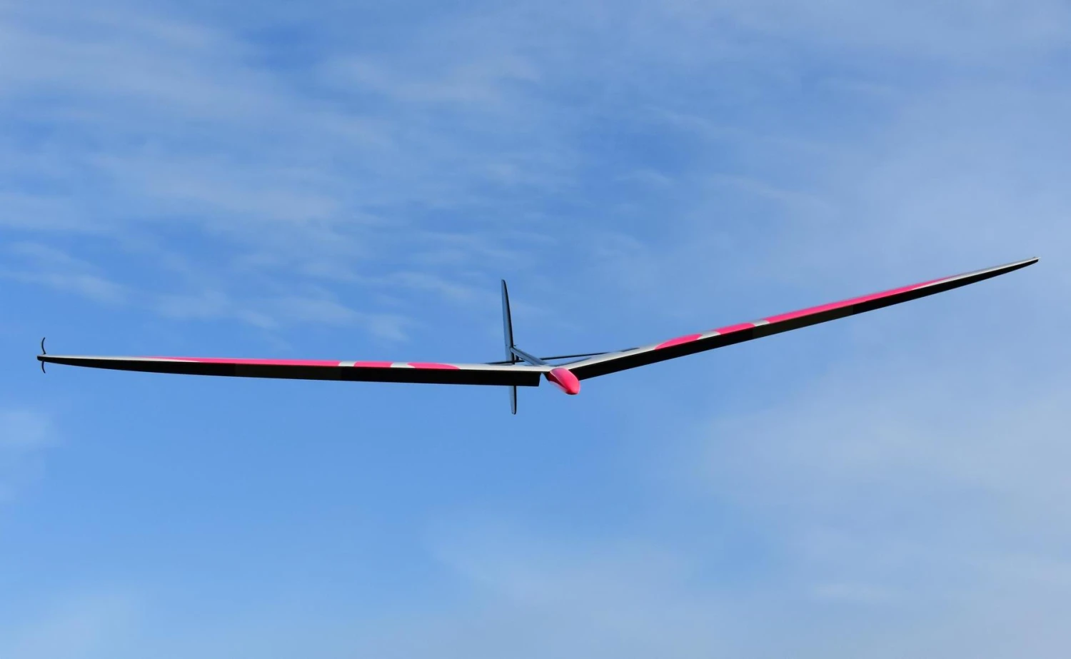 The generous 7 degree dihedral allows small RC inputs to be used when maintaining thermal turns, minimising control drag. The special wing tip shape was chosen to help make the model more recognizable and thus easier to fly in crowded thermals as often found in competitions.