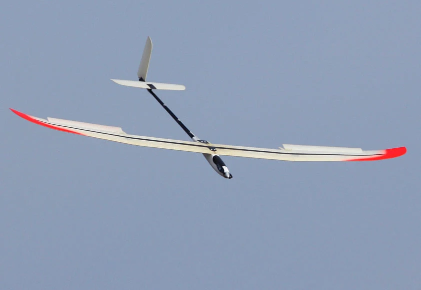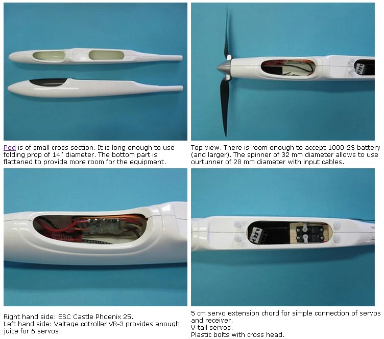 The nicely finished smooth glass skinned foam core wing has a substantial carbon spar. Each wing half is molded with the polyhedral in place, ensuring a very smooth and low drag surface, and good stability. The small lightweight fuselage pod is of glass/epoxy construction, so is 2.4GHz friendly, and can accommodate folding props up to 14″ diameter, allowing good climb rates. The convenient canopy hatch allows access to the electric motor and battery. The rear fuselage is made of a lightweight but long carbon boom, giving excellent flight stability.