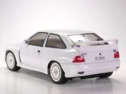This R/C model assembly kit recreates a 3-door hatchback Ford Escort Mk.6 with customizations such as blister fenders, front spoiler and rear wing. The powerful form is captured by a polycarbonate body which is based on the efficient shaft-driven 4WD of the TT-02 chassis.